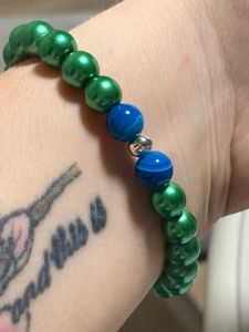 A ceramic toucan adorns this charm bracelet with jungle green pearlescent beads and two blue striped agate beads. A must for any lover of the jungle! Stretch, fits most wrists.