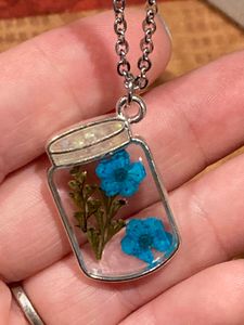 Real flower Mason jar necklaces in silver and gold. One is silver stainless steel with blue flowers and a glow in the dark sparkly jar lid, one is gold stainless steel with a hal...