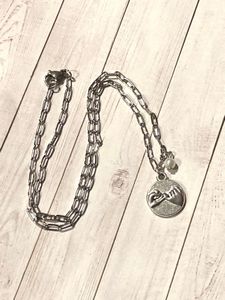 Stainless steel paper clip chain with metal alloy charm and faux pearl. 16.5” chain length.