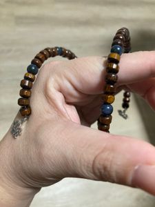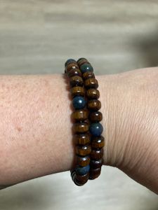 This memory wire bracelet is made with natural wood beads and lapis lazuli beads. The bracelet is accented with two stainless steel lotus flower charms. Fits most wrists.